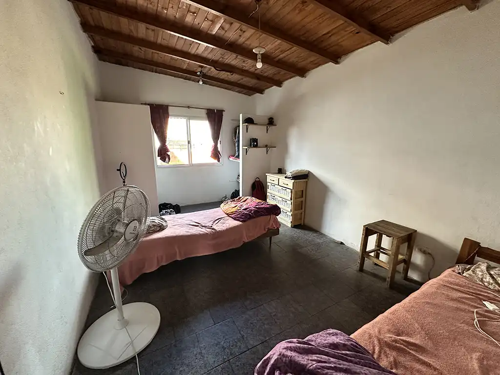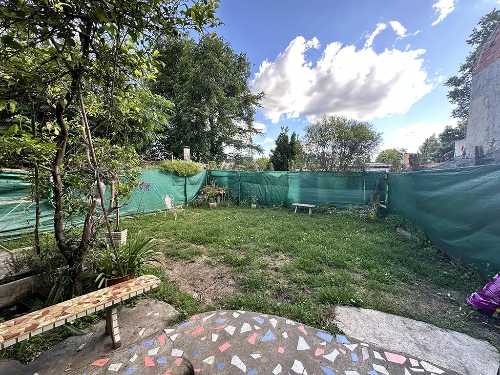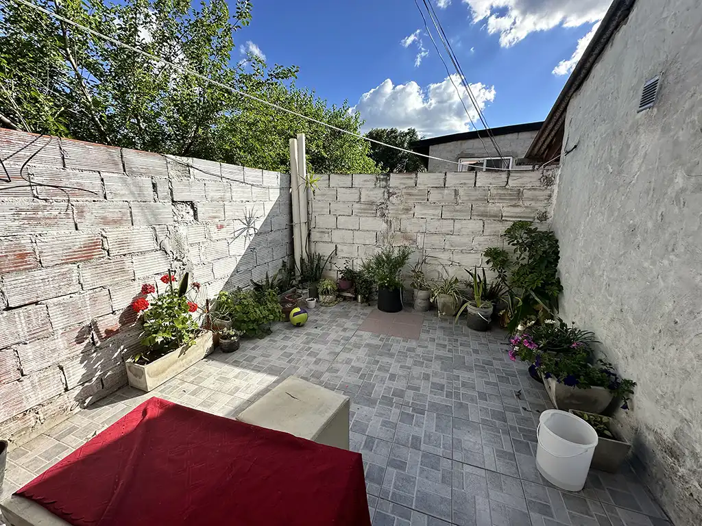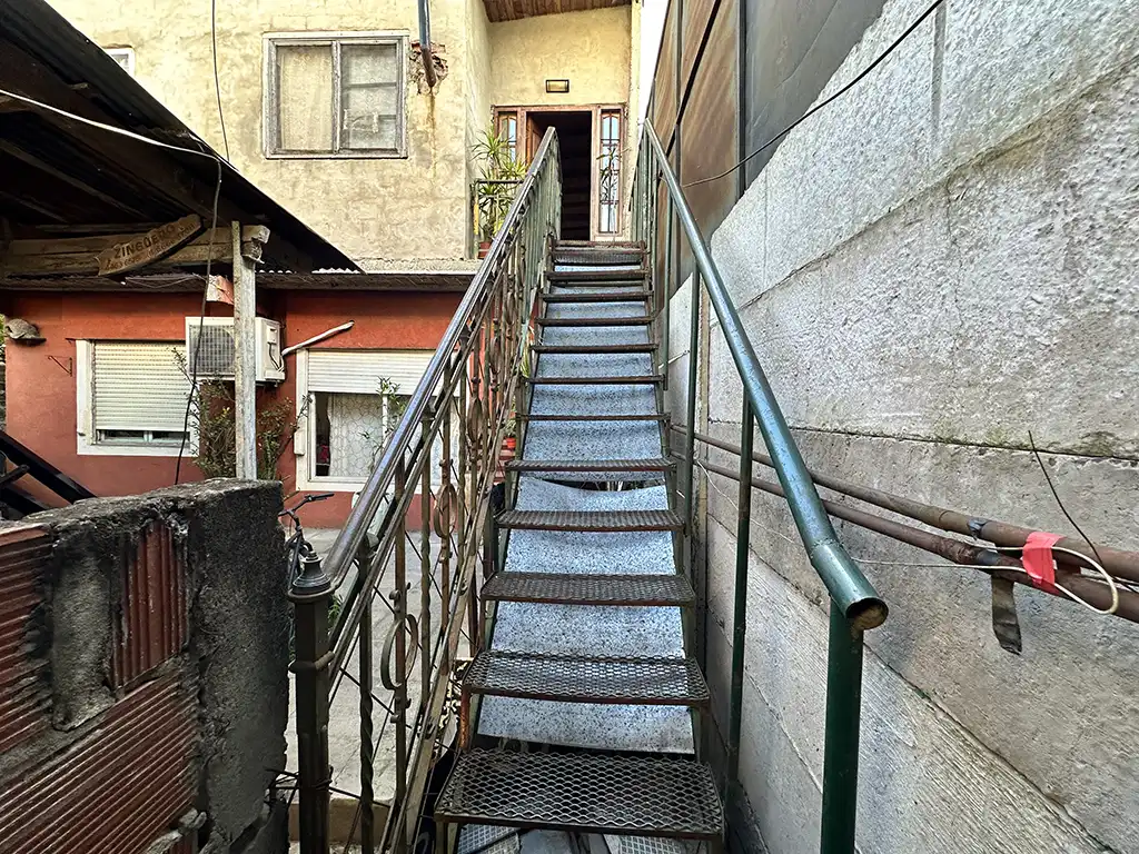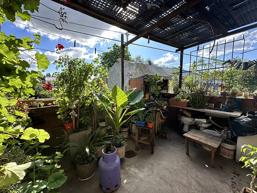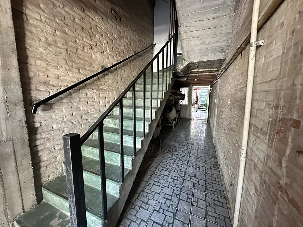 Un patio techado que antecede a dos viviendas. La primera es una casa en planta baja de tres ambientes con un amplio living comedor con cocina, dos dormitorios, baño completo y jardín al fondo. La segunda es una casa en planta alta de igual composicion a la cual se accede por una escalera independiente, la misma cuenta con un balcón terraza al fondo.