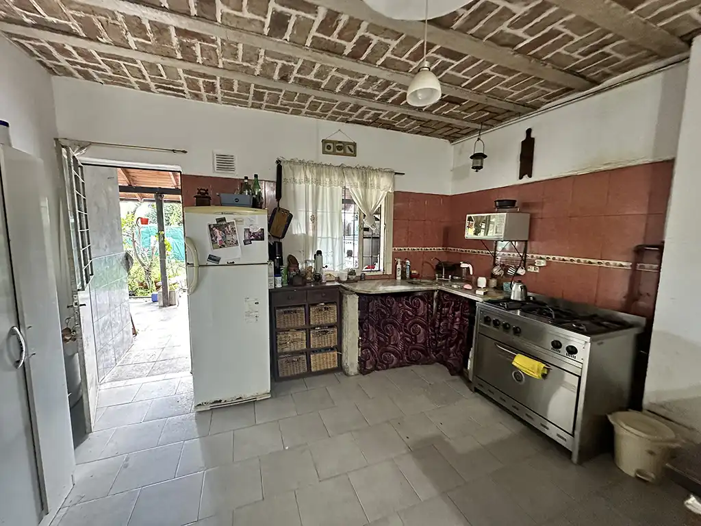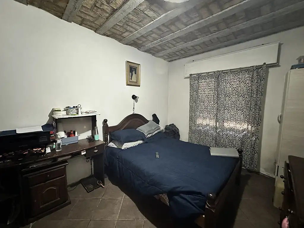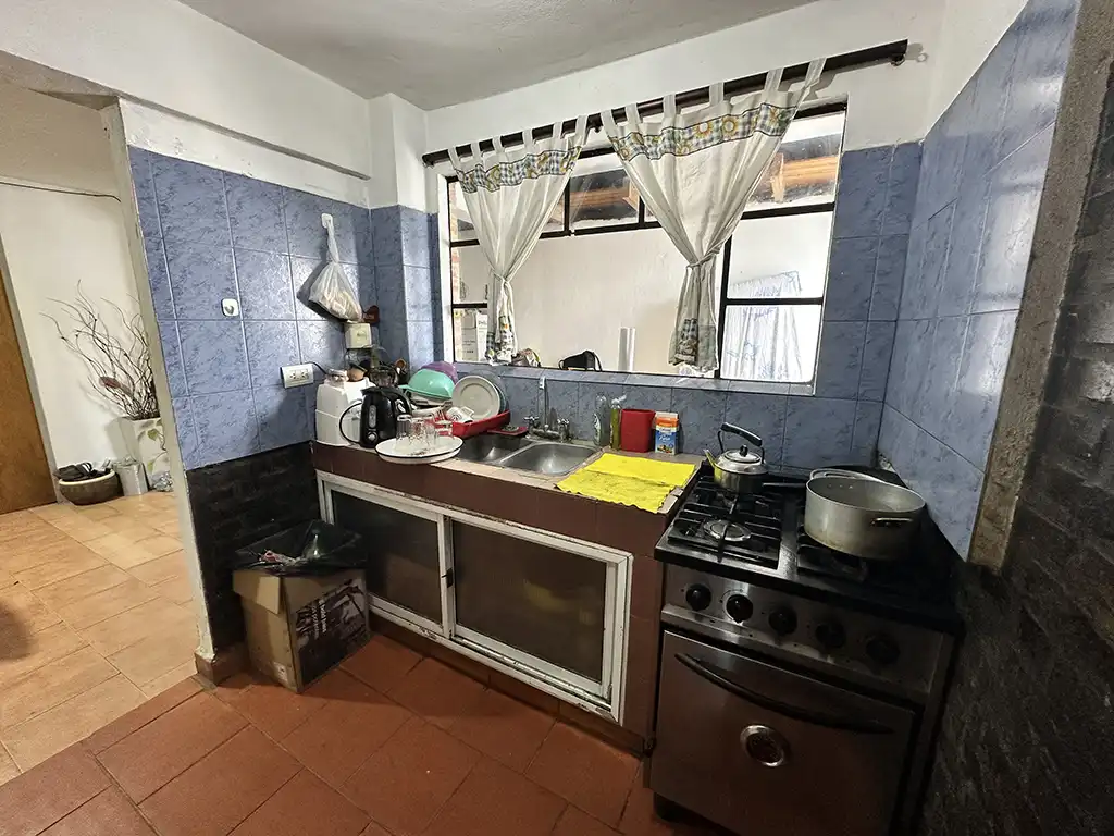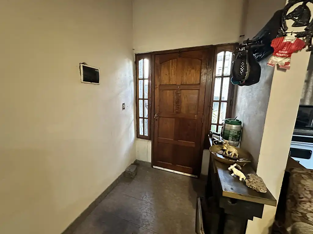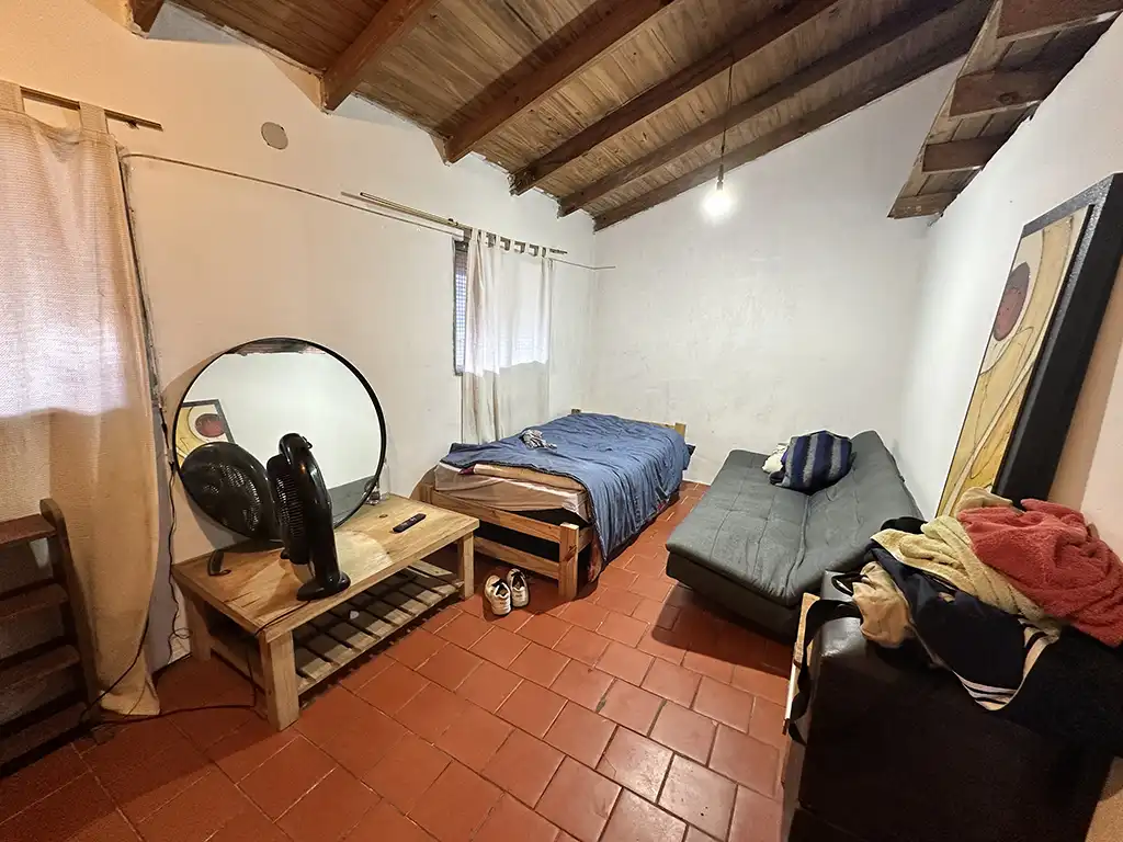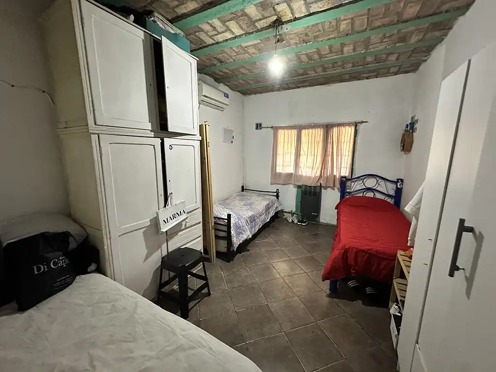 Un patio techado que antecede a dos viviendas. La primera es una casa en planta baja de tres ambientes con un amplio living comedor con cocina, dos dormitorios, baño completo y jardín al fondo. La segunda es una casa en planta alta de igual composicion a la cual se accede por una escalera independiente, la misma cuenta con un balcón terraza al fondo.