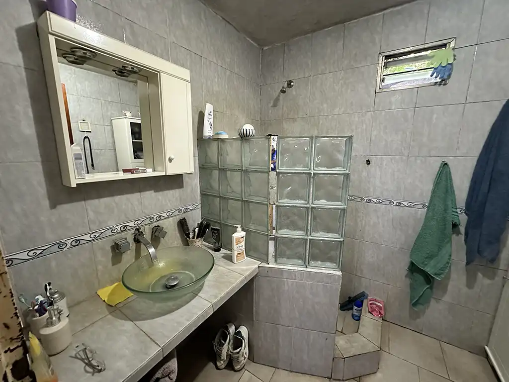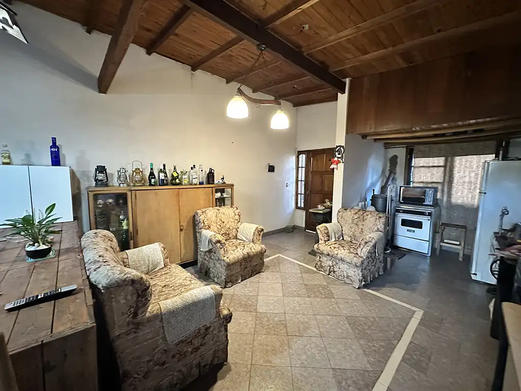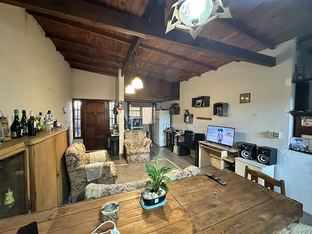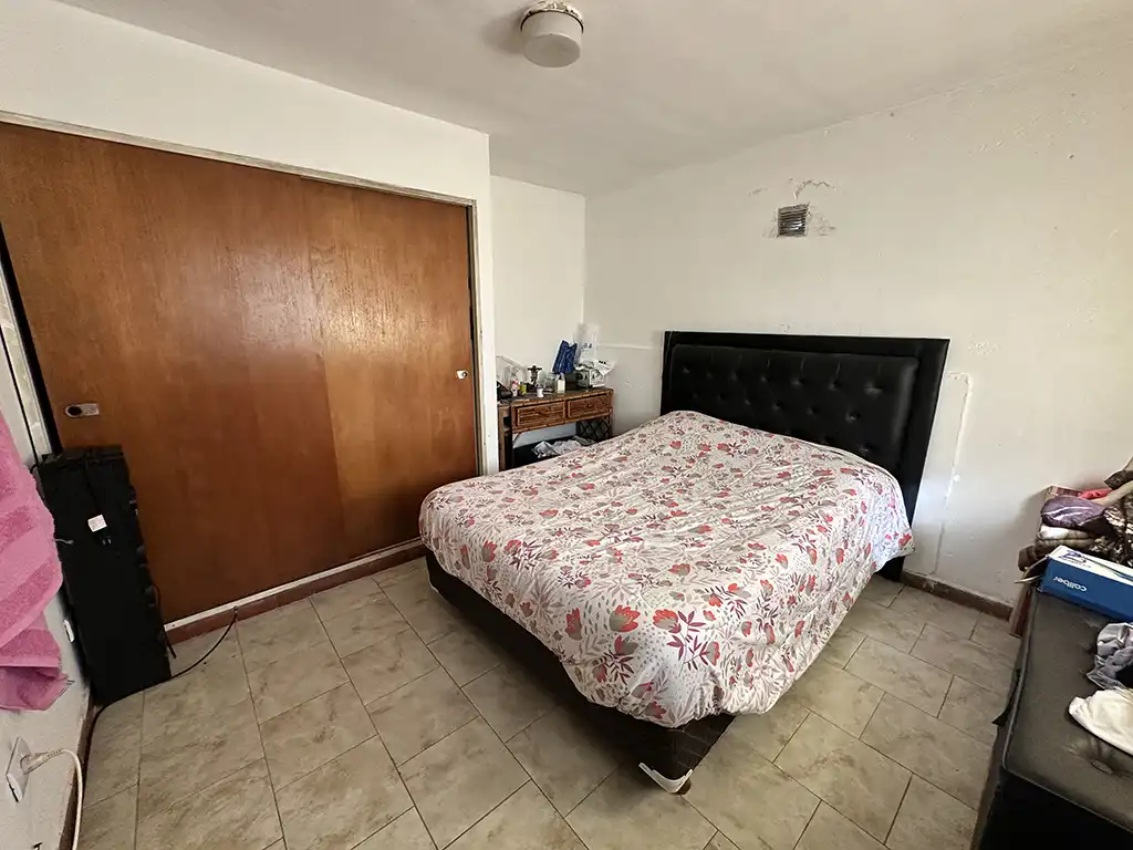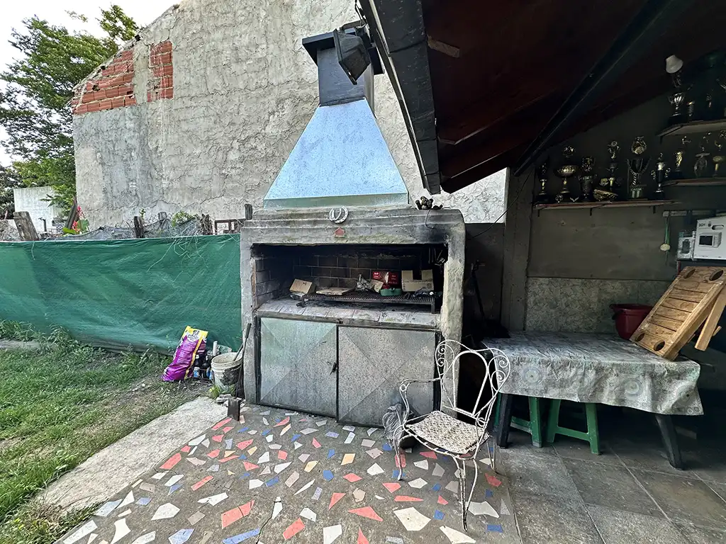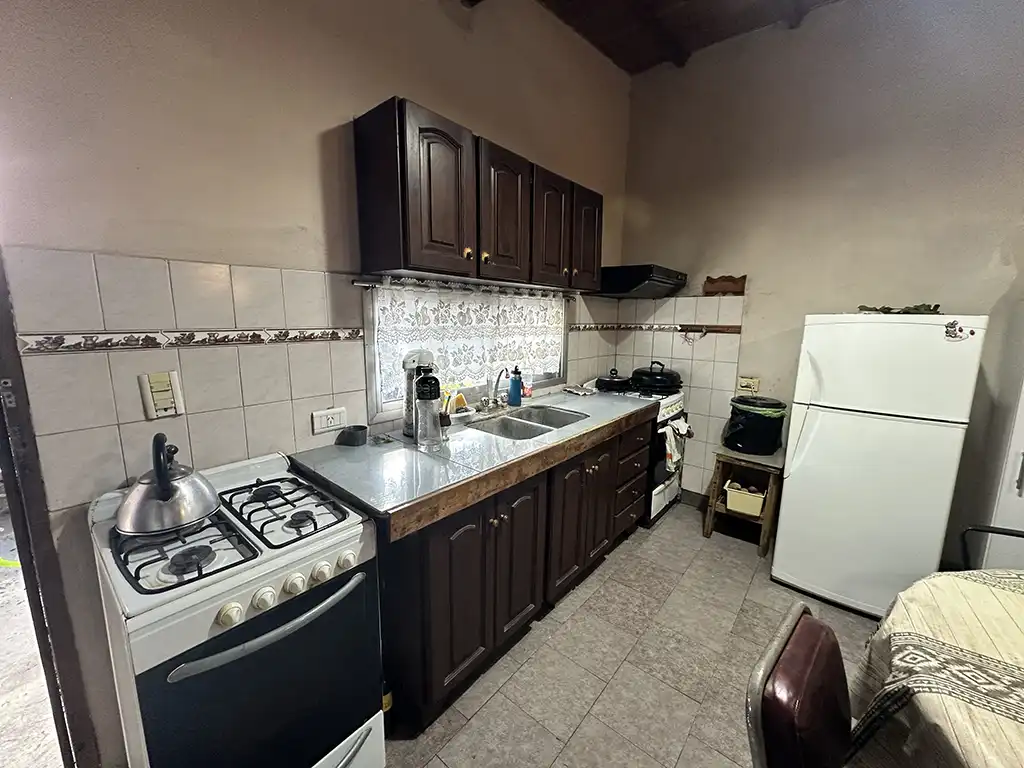 Un patio techado que antecede a dos viviendas. La primera es una casa en planta baja de tres ambientes con un amplio living comedor con cocina, dos dormitorios, baño completo y jardín al fondo. La segunda es una casa en planta alta de igual composicion a la cual se accede por una escalera independiente, la misma cuenta con un balcón terraza al fondo.